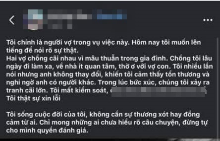 “Tôi chính là người vợ trong vụ việc này. Hôm nay tôi muốn lên tiếng để nói rõ sự thật.