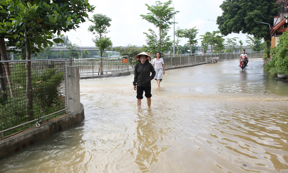 Nước trên sông Cầu đã rút nhưng khu phố Quả Cảm, phường Kinh Bắc vẫn ngập sâu, người dân đi lại khó khăn.